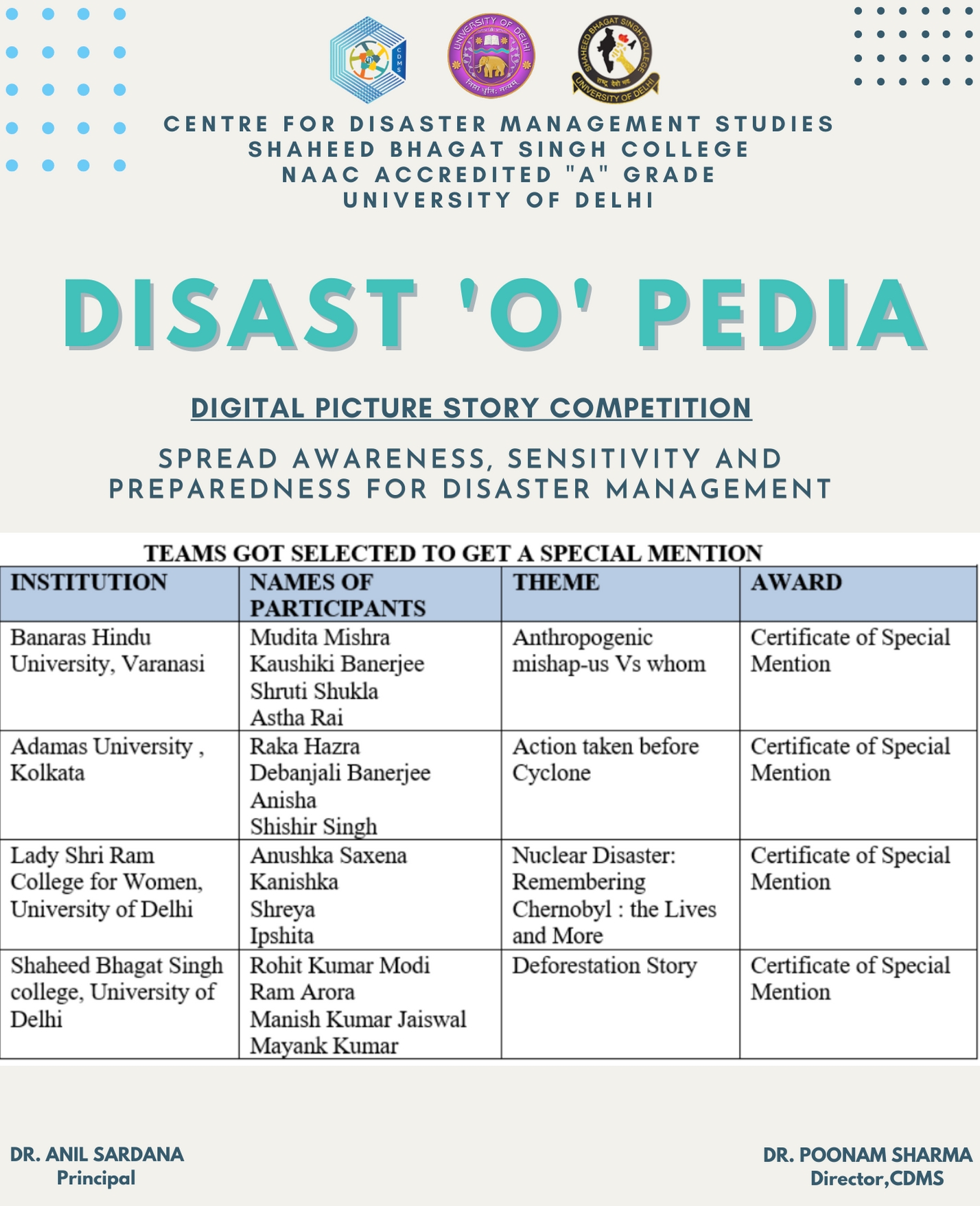 To instill a sense of awareness about the various aspects and intricacies of Disaster Management, Centre for Disaster Management Studies(CDMS) organised "Disast 'O' Pedia: A Digital Picture Story Competition" in November, 2020. The competition was open to both undergraduate and postgraduate students. The theme for the competition was chosen as "Spread Awareness, Sensitivity and Preparedness for Disaster Management." Overall, it was an enthralling event with overwhelming response and participation from students across colleges and universities.